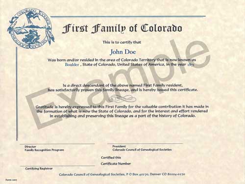 The First Families of Colorado Recognition Program was started by the Council in 1983. There are three categories of certificates: First Family, Territorial and Centennial. The certificates are numbered and show the ancestor's name and the name of the applicant. The certificates are suitable for framing.
